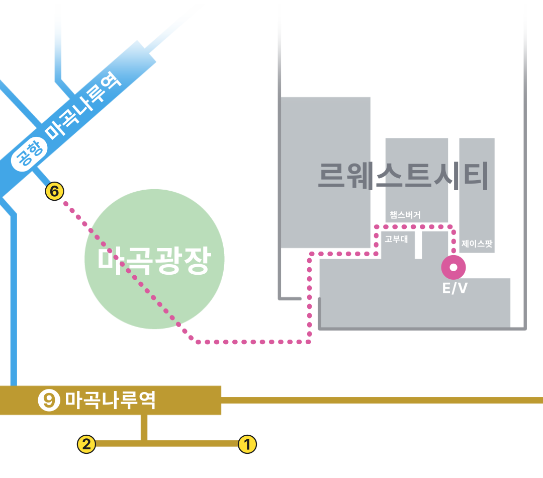 6번출구 마곡광장방향에서 에스컬레이터 탑승후 르웨스트시티 방향